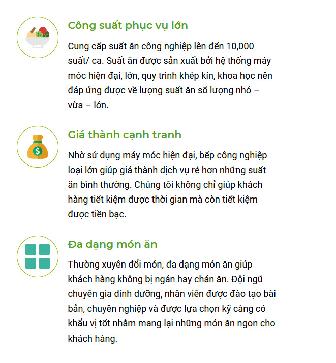 Mỗi suất ăn được đảm bảo cung cấp đầy đủ chất dinh dưỡng cần thiết cho cơ thể. Thông qua quá trình nghiên cứu nghiêm túc và thấu hiểu khách hàng, chúng tôi chú ý những thành phần dinh dưỡng khác nhau phù hợp với từng đối tượng khách hàng (trẻ em, học sinh, bệnh viện, nhân viên văn phòng, công nhân…) nhằm mang lại không chỉ năng lượng cho một ngày làm việc hiệu quả mà còn đầu tư vào sức khỏe lâu dài của khách hàng.